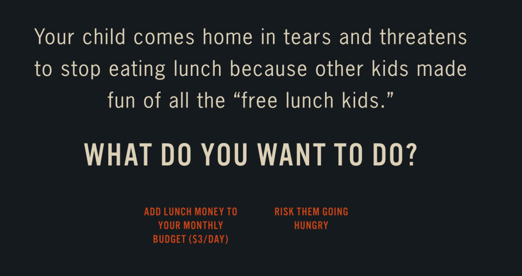 This is what Spent asks its site visitors to think about. “PlaySpent” is a game created to help people understand the real weight of poverty and the challenges that some people face every day.